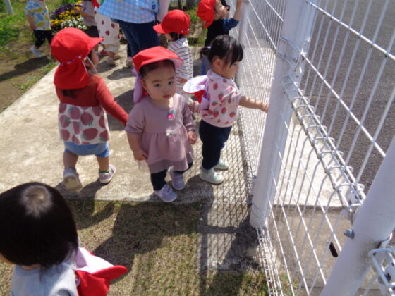 遊具で沢山遊んだ後は、こいのぼりを見に行きました。子どもたちは、こいのぼりを指さしながら「あか!」「あおー!」と大興奮!皆で「こいのぼり」の歌を歌い、楽しみました☺