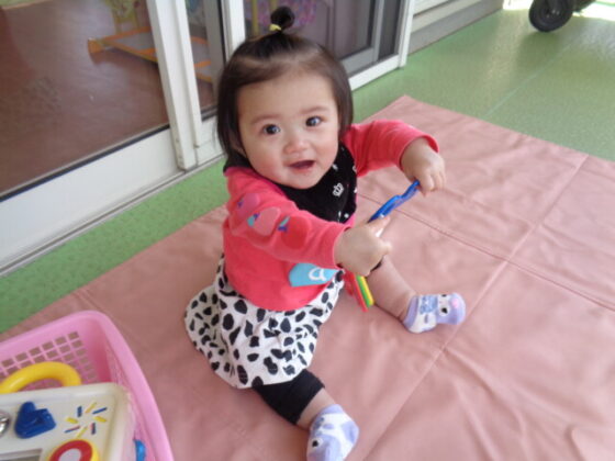 その後、テラスで玩具で遊び、”みてー♪”と言わんばかりの表情で保育士に訴えかける様子が可愛らしかったです♡