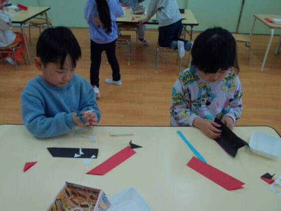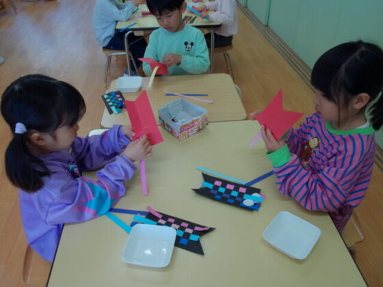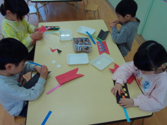 こいのぼりの製作をしました。今日から園庭にもこいのぼりが泳いでいたので、「こいのぼりが泳いでるよ~!」と嬉しそうに眺めていた子どもたち。「今日の製作は難しいかも…」と話すと「できるかな?」「うめ組さんだからできるよ!」と話していました☺お父さんこいのぼりとお母さんこいのぼりのしっぽと目を切ってからスタートです!細く切られた画用紙の中から好きな色を3枚選んで(4枚挑戦する子もいました!)こいのぼりの台紙に編み込んでいきます。1本目は出来るのですが2本目はスタートをずらさなければいけないので、意味が分からず苦戦している子もいました。苦戦していた子も保育士と一緒に最後まで諦めず頑張りました。みんな真剣な表情で集中して行っていました。格子模様が出来上がってからは、切った目をのり貼りしました。後日、空色の画用紙に貼って泳がせる予定です♪