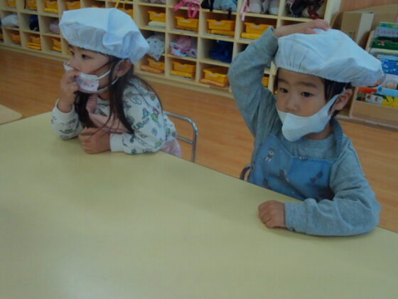 実際にエプロンや帽子を付けてみると「ママみたい!」「早くご飯作りたいよ~」と言っていました。初めての身支度練習でしたが、みんな一生懸命エプロンを着たり帽子を被ったりしていました。次回からのクッキングがとっても楽しみなゆり組です♪