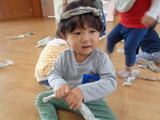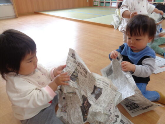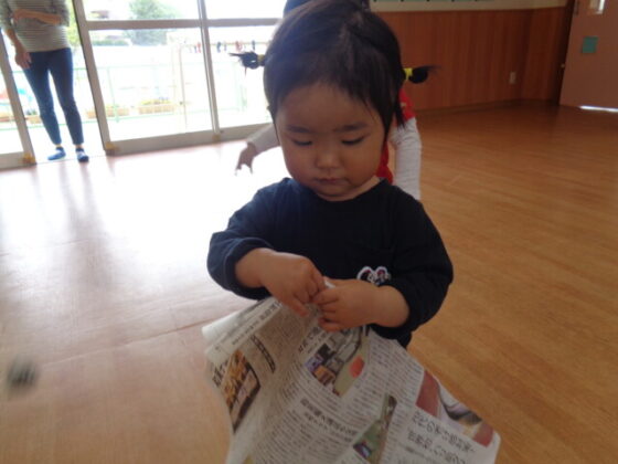 ビリビリ破いたり、小さく丸めたり、自由自在に形が変わる新聞紙に皆興味津々でした☆