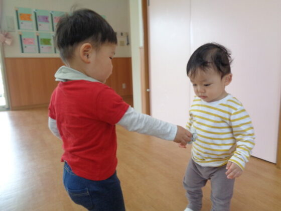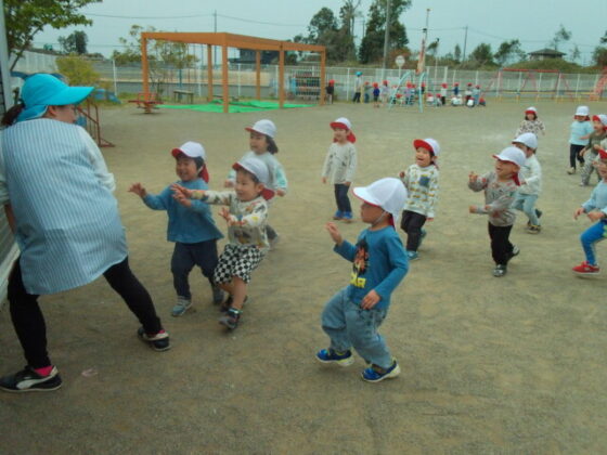 戸外に行き、最初に子どもたちからのリクエストで”だるまさんがころんだ”をしました。鬼役の保育士にばれないように「だるまさんが…」の間に急いで進み、「ころんだ!」と同時に”ピタッ!”と止まる子どもたち…。ギリギリを攻めすぎて鬼に動いているのがばれてしまい捕まってしまう子もいました☺