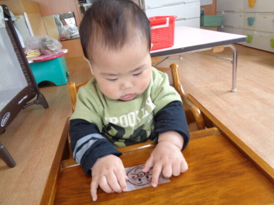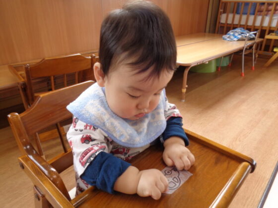 テープ剥がしに挑戦しました。なかなか取れないなー…と試行錯誤しながら、カリカリテープの端っこを剥がそうと集中している様子が可愛らしかったです☺