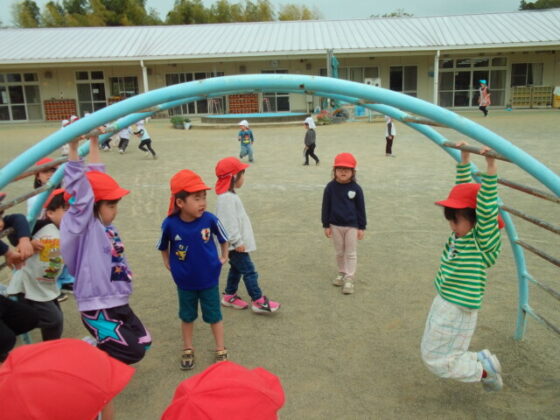 鉄棒に挑戦しました。前回りを練習すると、「先生出来るよ」という子と、「先生怖い」と言う子がいました。怖い子も、頑張って全員挑戦し保育士に介助されて出来ました。また、練習して全員出来るように頑張りたいです。