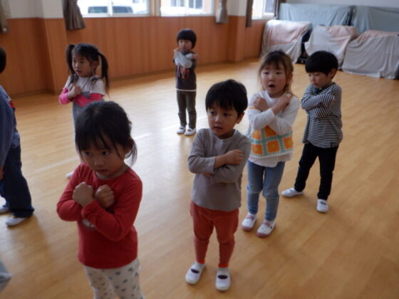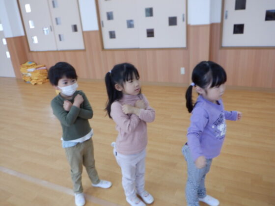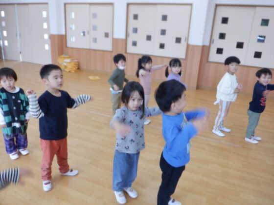ホールで運動遊びをしました。はじめに「元気玉飛ばせ」や「ディズニー体操」を踊ってよく身体を動かしました。構えている姿がかっこいいですね♪「やあ!」の掛け声を元気いっぱいに言っていました♪