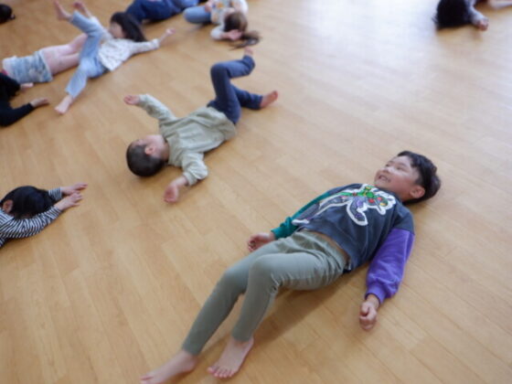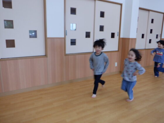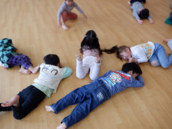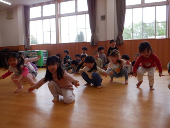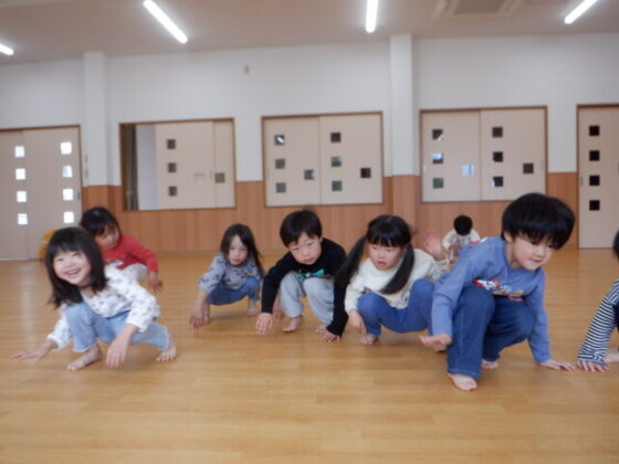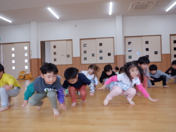 その後は裸足になり、ひよこ歩きやカエル跳びなど色々な動きを楽しみました。一つ一つの動きを確認しながら沢山練習!少しずつ上手に出来るようになりました♪