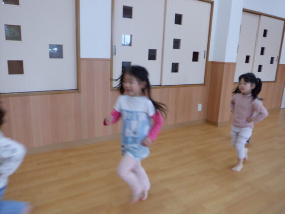 最後はホールをぐるぐる円状に走りました♪「まだいける‼」とまだまだ体力が有り余っている様子で、得意気な子どもたちでした☆