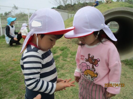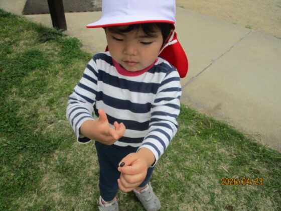 築山で遊びました。早速虫を発見!!「先生!ダンゴムシだよ!」と手に載せて見せてくれました♪