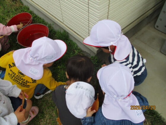 バケツを動かすと、たくさんのダンゴムシに子どもたちは大興奮!!近くにカナヘビもいて少しおどろいていました。