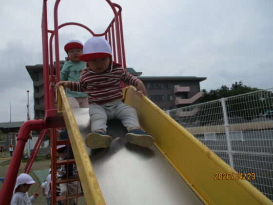 今日は、滑り台でも遊びました♪階段を上ると高くて少しドキドキしている様子でしたが、無事滑りきると嬉しそうに「もう一回!」と繰り返し滑って楽しんでいました♪
