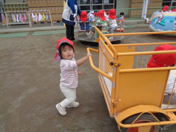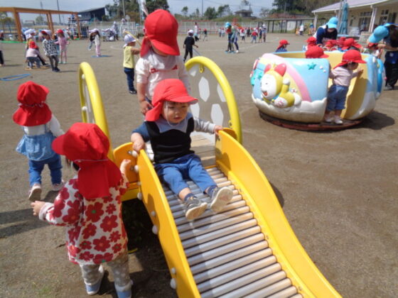 園庭で遊びました。ローラー滑り台や、メリーゴーランドが人気で順番に楽しみました。ローラー滑り台は、自分でどんどん滑る子もいれば、座ってスタンバイし、保育士に押してもらうのを待っている子もいました。着地もタイミングよく立ちあがれる子も増え、保育士に「上手!」「かっこいい」などと褒められると得意げな表情の子どもたちでした。