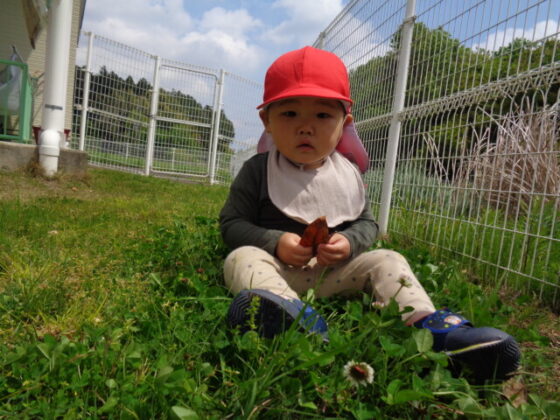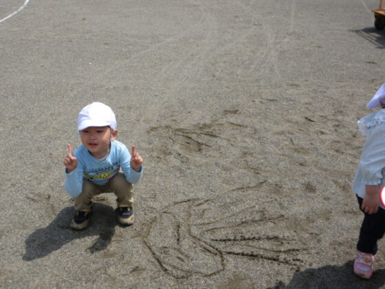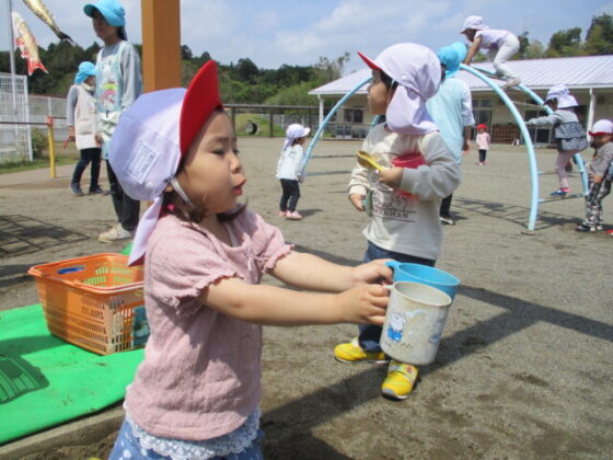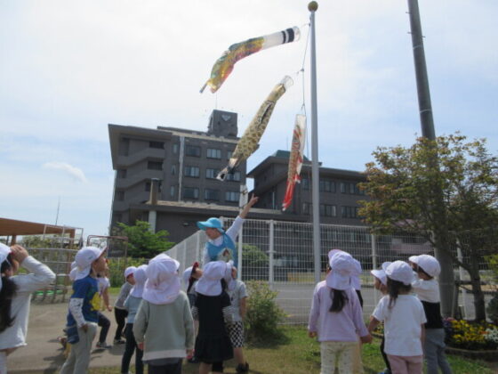 戸外に行き、最初にこいのぼりを見に行きました。真下からみると迫力があり「大きいね~!」「先生、ジャンプして触ってみて!」等と言ったりこいのぼりの歌を歌ったりしていました。