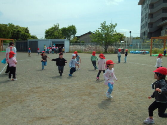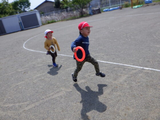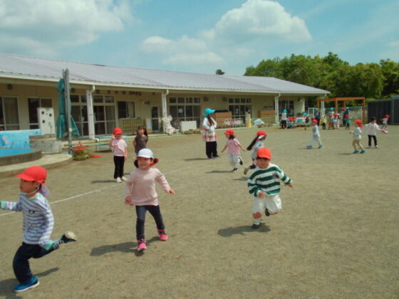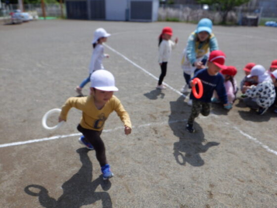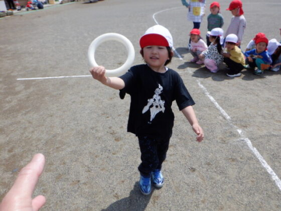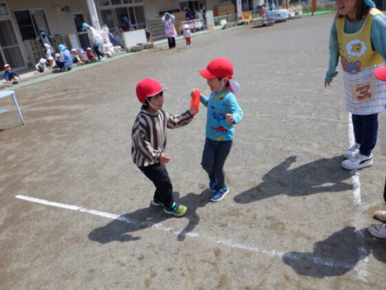 戸外に出て、リレーをしました。今日はバトンを使用したので、よりやる気満々な子どもたちで、一緒に走る子に負けないようにと一生懸命に走っていました。誰にバトンを渡すかもしっかりと理解し、上手に渡す事ができていました♪