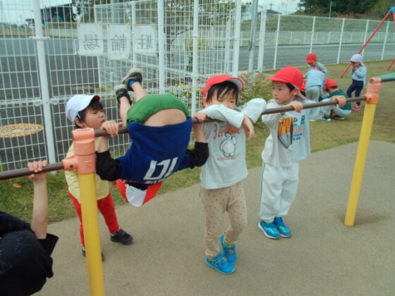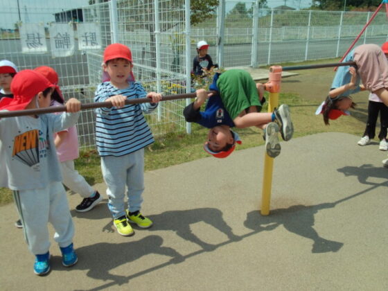 リレーの応援後は、”鉄棒ぶら下がり対決!”をしました。「こんなの簡単だよ~」と得意げに言う子、「ちょっと難しかったよ…」と言う子と様々でした☺