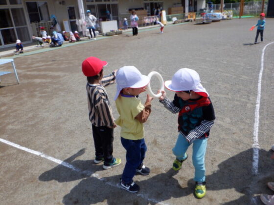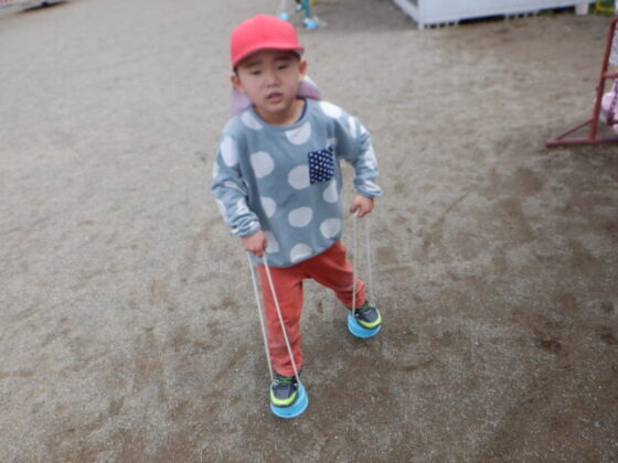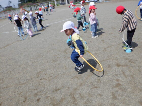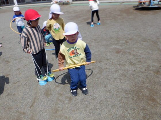 その後は、缶ポックリやフラフープ、大縄跳びを楽しみました。大縄では、よく縄を見ながらジャンプ!連続で沢山跳べると嬉しそうでした♪