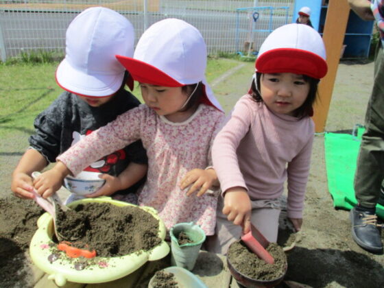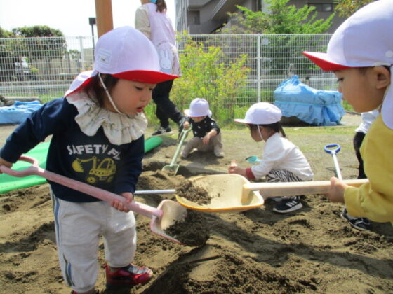 山作りでは、大きなシャベルを頑張って動かし砂を一生懸命のせていきます!!わざわざ一番遠い場所で砂を掘り、山を作る姿も見られました。