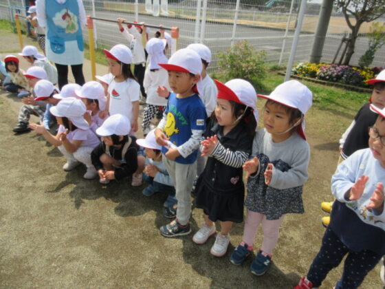 こいのぼりを見ている途中、園庭の真ん中でたんぽぽ組による紅白リレーが始まったので応援しました。