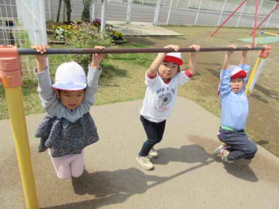 戸外遊びをしました。たんぽぽ組のリレーを応援した後、皆で鬼ごっこをしました。捕まった人は円の外に出て応援にまわります。保育士も混ざりましたが、フェイントをかけて逃げる子もいました!鬼も逃げる子も笑顔で走り楽しんでいました☺4回戦ほど行いましたが、少ない人数でも鬼チームが勝っていました。その後は自由に遊びました。鉄棒にハマっているうめ組なので、前回りや逆上がりの練習を頑張っています!